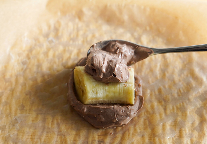 - ④水で戻したライスペーパーの上に、<②の1/4量→カットしたバナナ→②の1/4量>の順で乗せる。